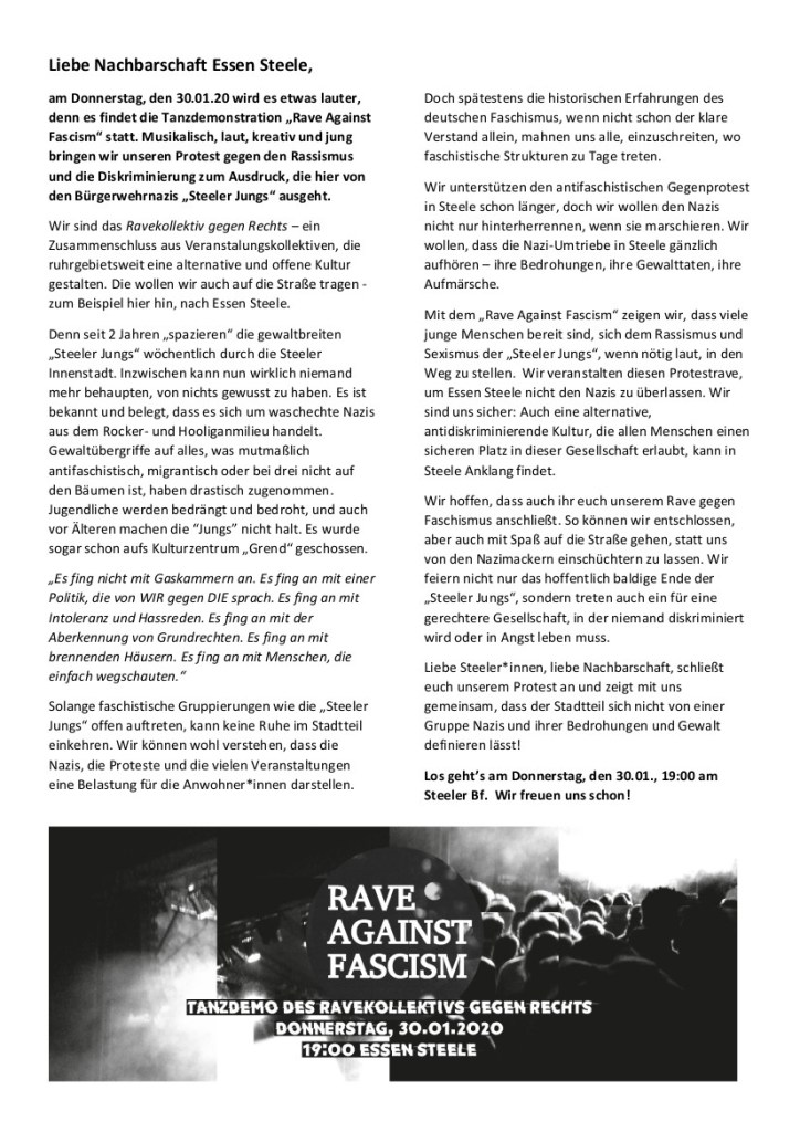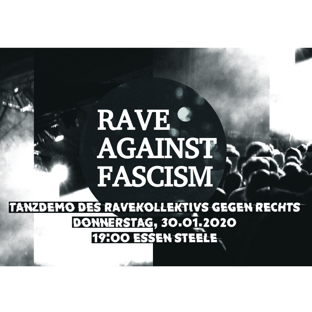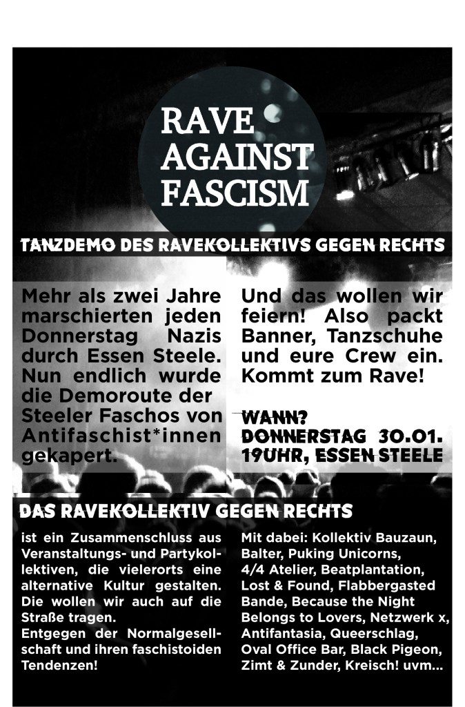 Premiere feiert(e) das Format am Donnerstag, den 30.01.2020 in Essen-Steele. Wir rav(t)en gegen die Vereinnahmung des Stadtteils durch die faschistoide Bürgerwehr “Steeler Jungs”. Los gehts um 19:00 am Steeler Bf (vorne raus, am Taxiparkplatz) und hier gehts zur Facebook-Veranstaltung: RAVE AGAINST FASCISM-Tanzdemo.