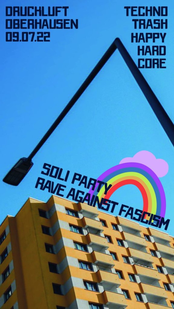 Freund*innen des gepflegten Geschrammels, traumhaften Technos und hemmungslosen Happy Hardcores aufgepasst – eine neue Party geht an den Start. Kommt am 9.7. ins Druckluft, um mit uns gemeinsam bei einem hopfenhaltigen Kaltgetränk, Solischnaps oder ähnlichem auf zwei Floors die Nacht zum Tag zu machen – und das ganze für einen guten Zweck!